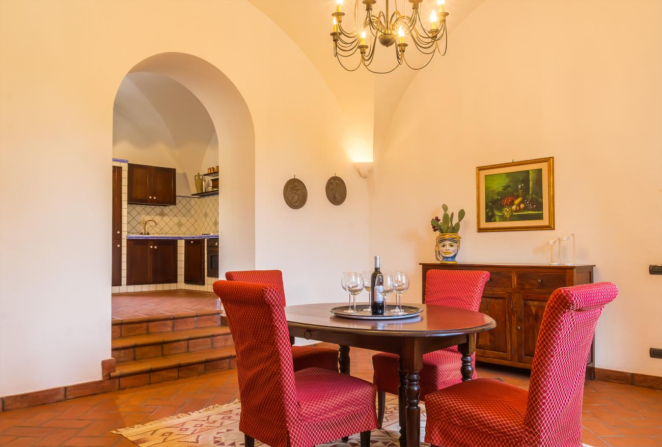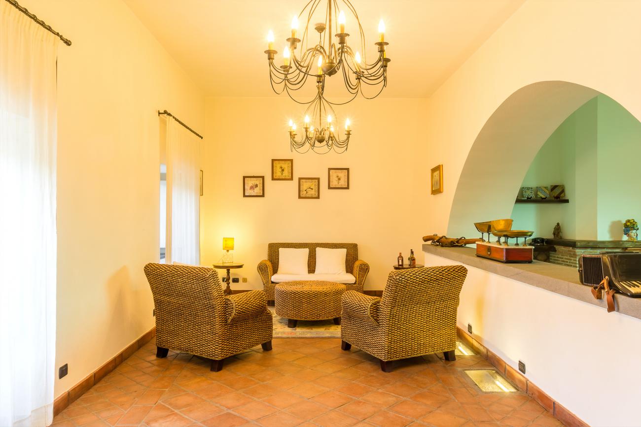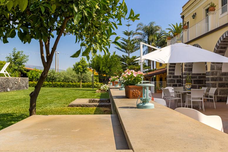 La casa, dotata di ingresso indipendente, offre agli ospiti al piano terra un grande salone su due livelli realizzato nell'antico palmento con un caratteristico camino, una zona lettura e relax nella zona sottostante il palmento, zona pranzo, una grande ed attrezzata cucina con camino e un bagno con doccia, Dal salone si ha accesso agli spazi esterni pavimentati e arredati, che continuano con un meraviglioso prato inglese e solarium attrezzato a bordo dell'ampia piscina in muratura.