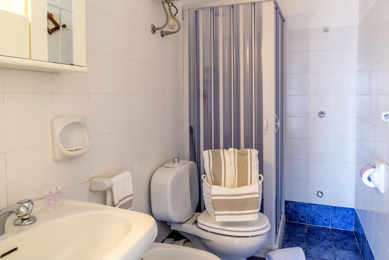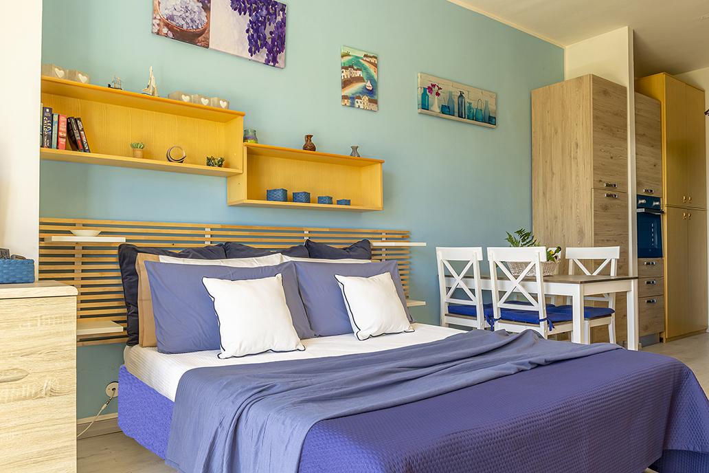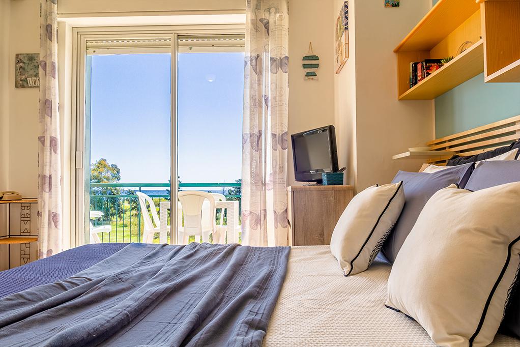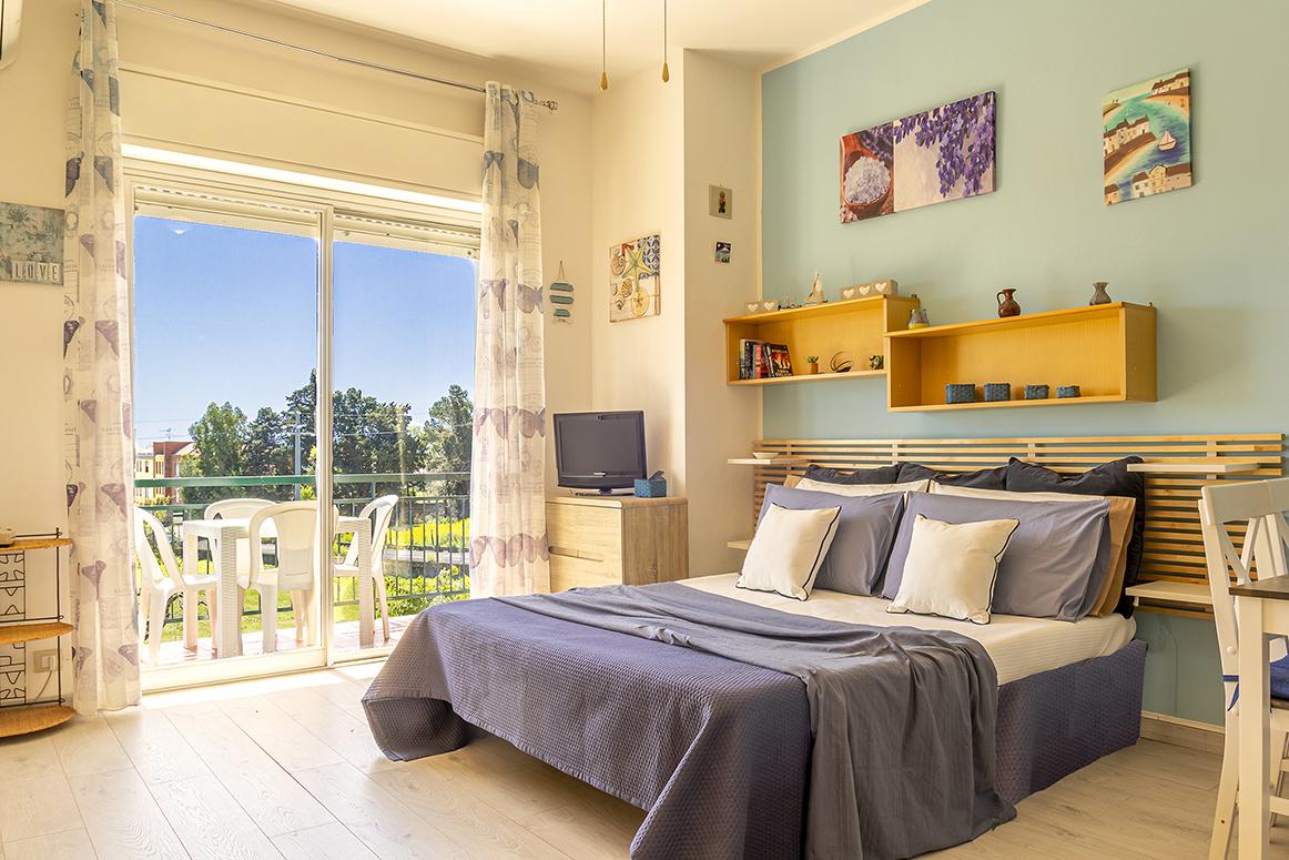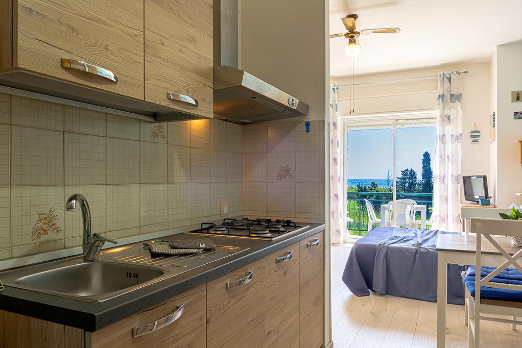Accogliente monolocale con vista mare composto da un unico ambiente con angolo cottura, divano letto, letto singolo, zona pranzo, bagno e terrazzino vista mare.