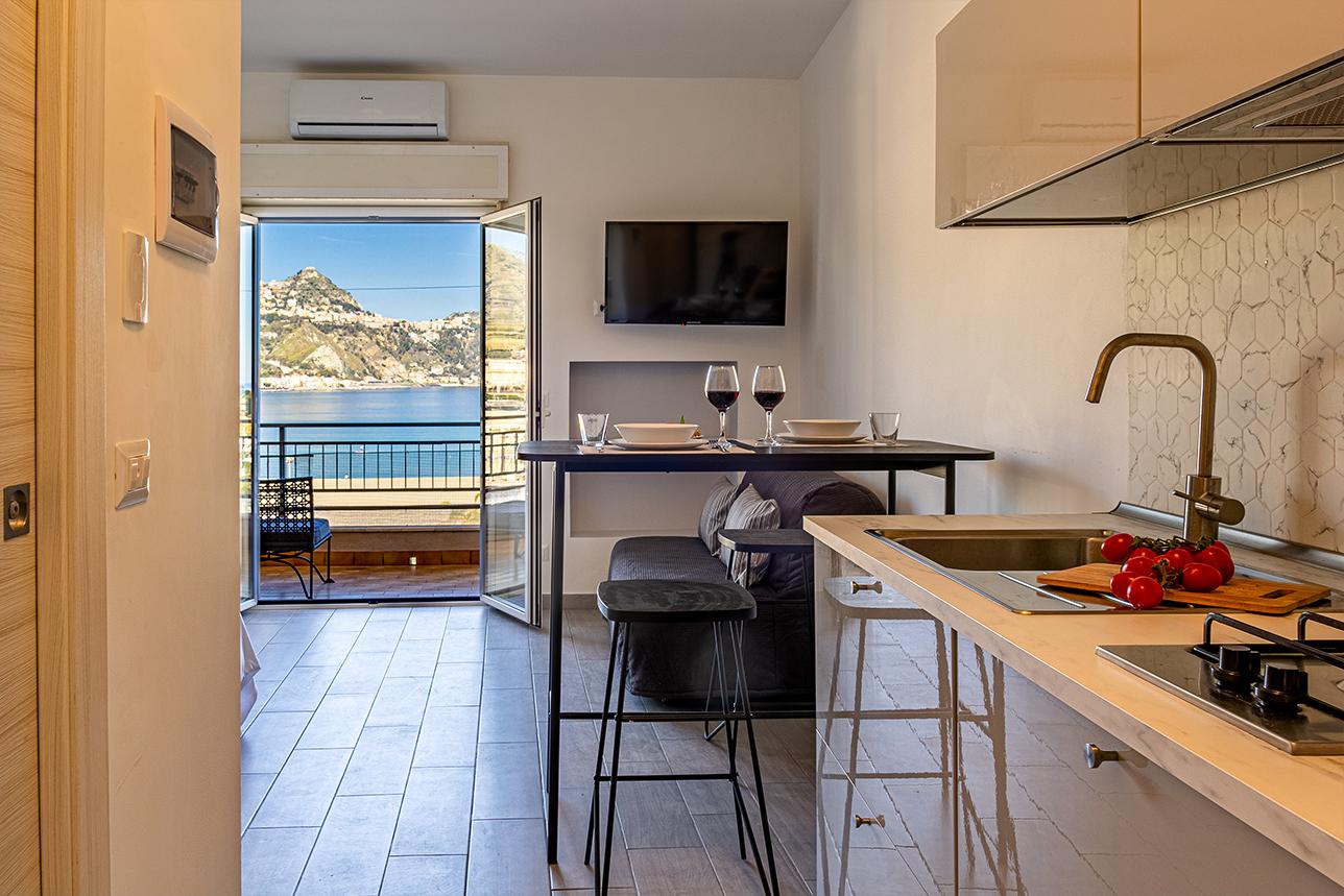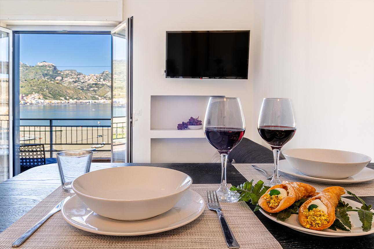 Sapore di Mare è un elegante monolocale situato nel pieno centro di Giardini Naxos, a 50 metri dal mare. La struttura è composta da una cucina soggiorno, zona notte con letto matrimoniale e bagno privato completo. La cucina, completa ed accessoriata, consente ai nostri ospiti di organizzare i propri pasti in assoluta autonomia e comodità. La zona living è composta da divano, tavolo da pranzo e TV. Il bagno, completo di tutti i servizi, include anche i prodotti da bagno in omaggio. L'area esterna, caratteristica peculiare della struttura, si affaccia direttamente sulla baia con una meravigliosa vista del mare e del lungomare di Giardini Naxos, ideale per pranzare e cenare all'aperto godendo del panorama. La sua ubicazione è l'ideale anche per muoversi agevolmente a piedi sul lungomare e di usufruire dei vari negozi e delle prelibatezze culinarie che i vari ristoranti della zona offrono.