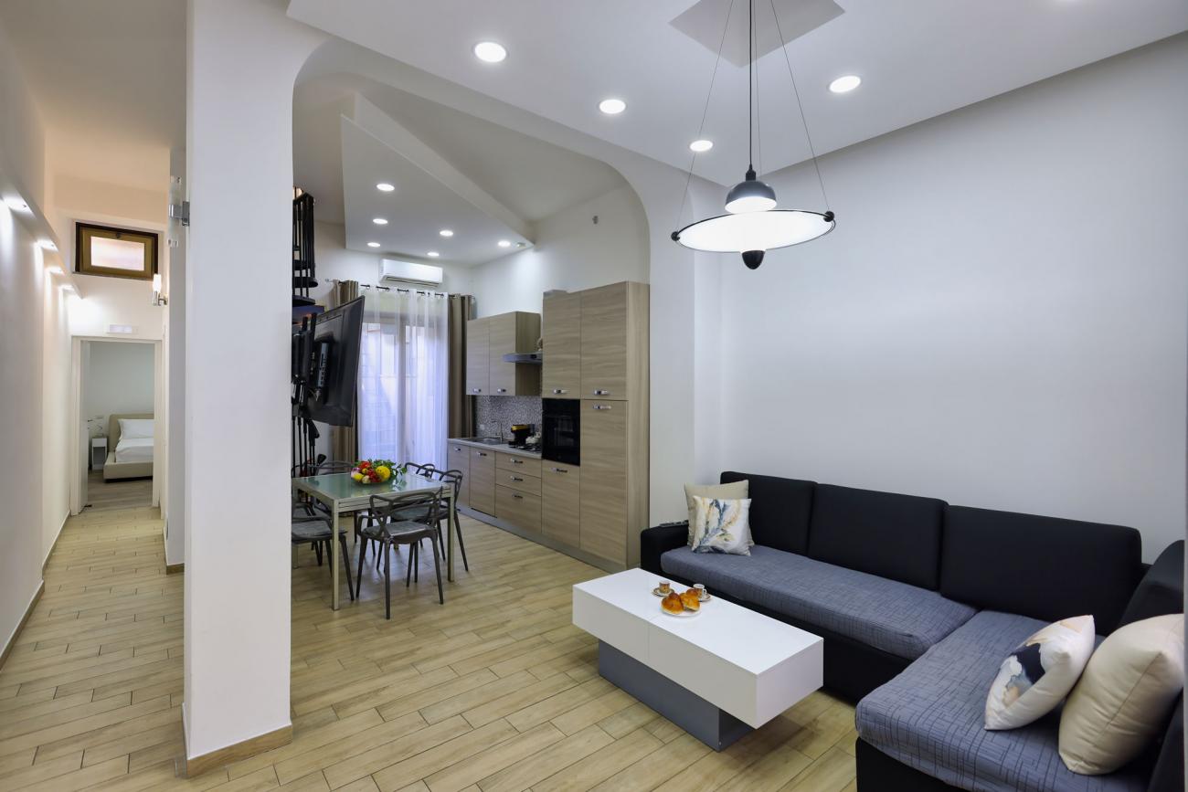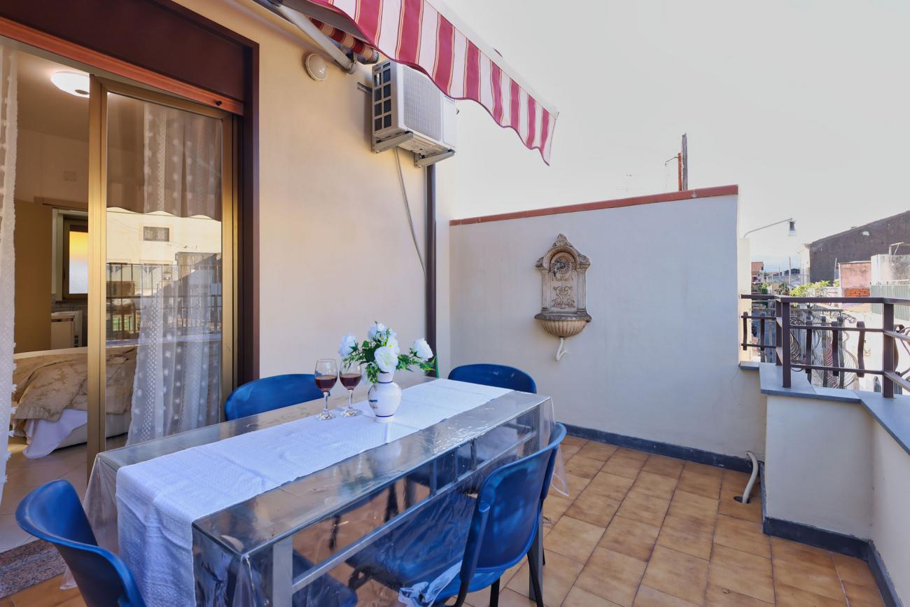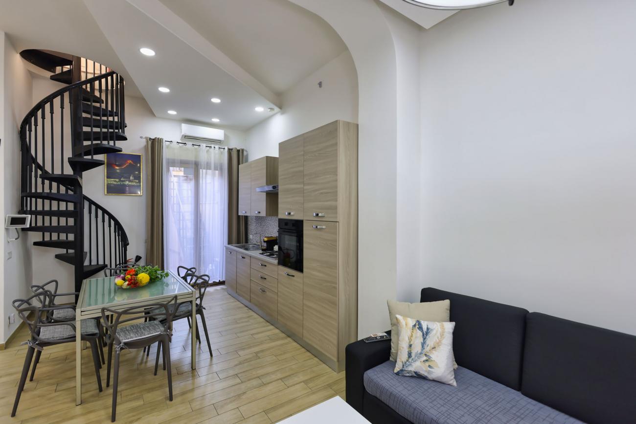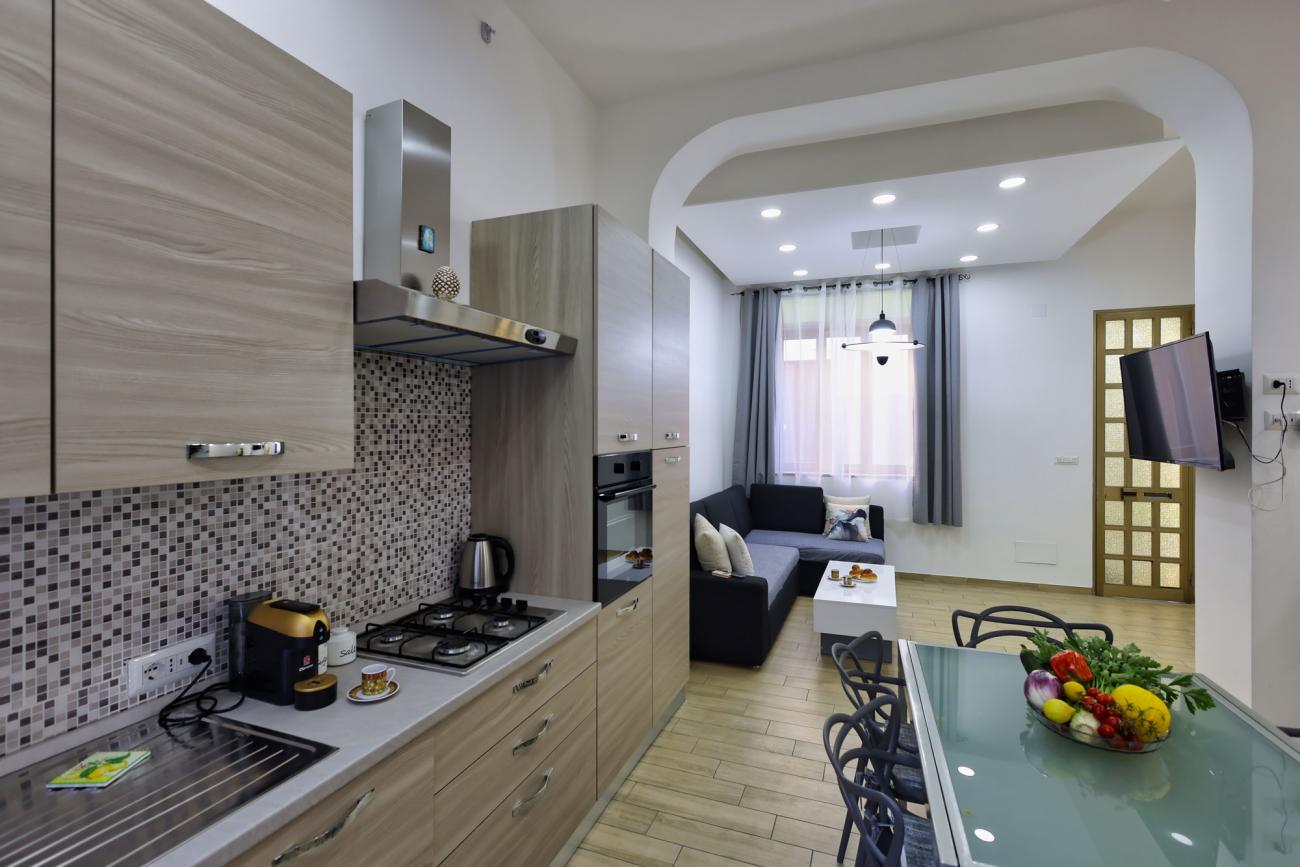 La cucina è completamente attrezzata, perfetta per preparare pasti in autonomia. A disposizione anche un terrazzino privato con vista sulla città e sul caratteristico quartiere circostante, ideale per una colazione all’aperto o per rilassarsi a fine giornata.